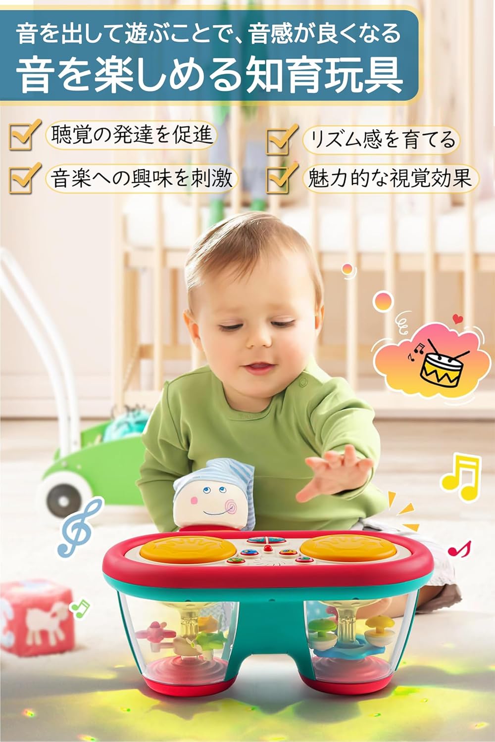 モンテッソーリ おもちゃ ドラム 赤ちゃん 楽器 知育玩具 早期教育 指先訓練 音の出るおもちゃ 音楽玩具 8色回転ライト 10曲メロディ 8種類楽器音 モンテッソーリ教具 男の子 0歳 1歳 女の子