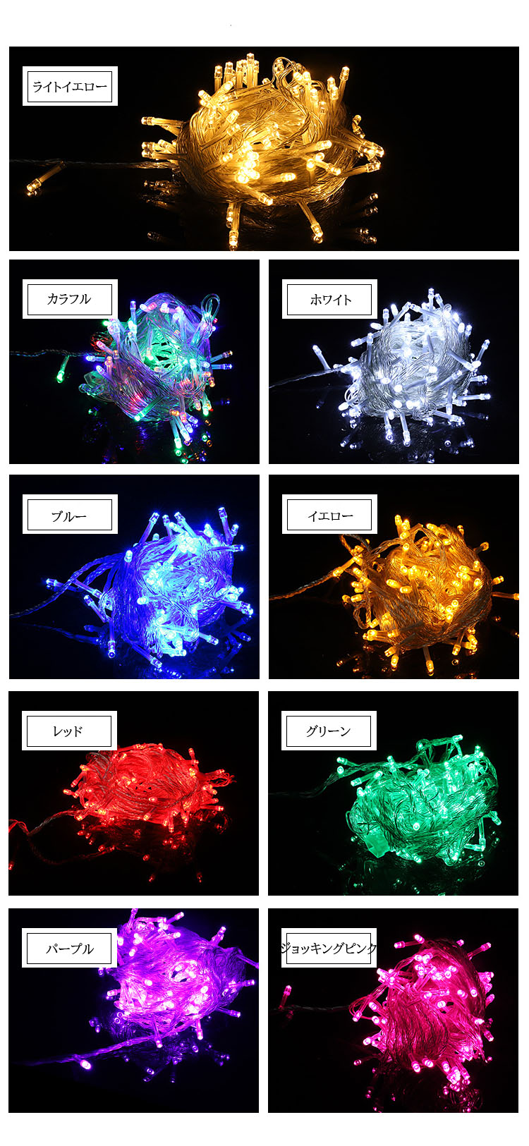 LEDイルミネーションライト 100球 ライトイエロー カラフル ホワイト ブルー イエロー レッド グリーン パープル ジョッキングピンク