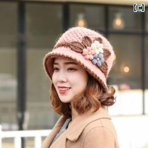 ニット帽 レディース 秋冬 毛糸 帽子 花柄 裏起毛 バケットハット 冬用 婦人帽 防寒 あたたかい