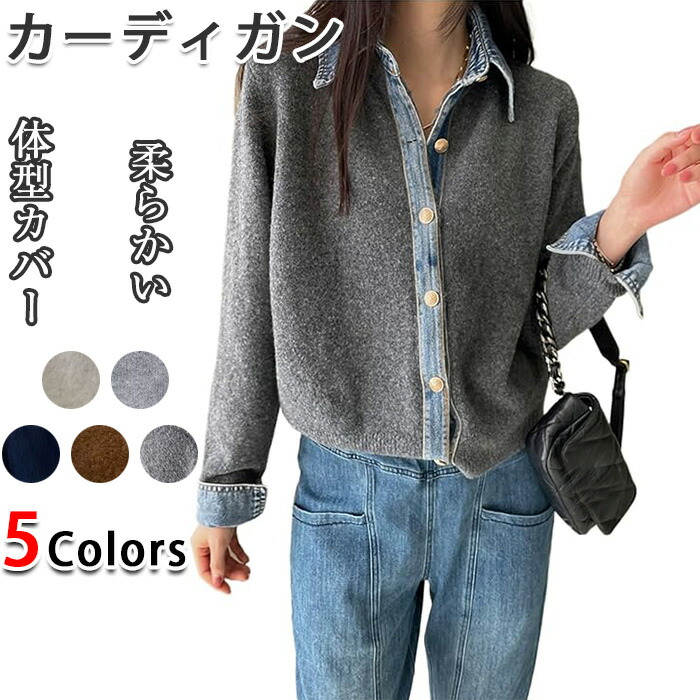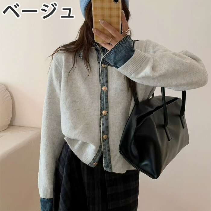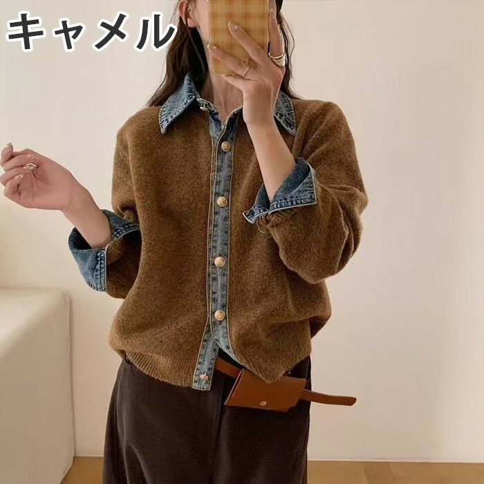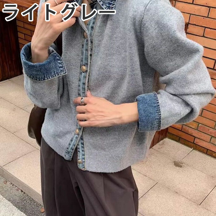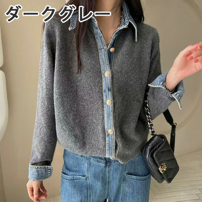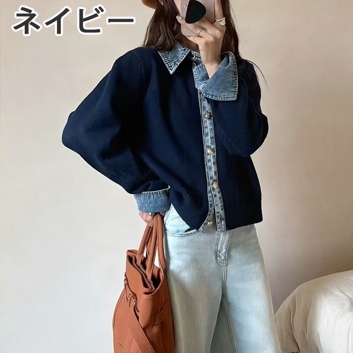 デニム×ニット パッチワーク カーディ トップス カーディガン ボレロ 続々入荷中 ダークグレー ライトグレー ベージュ ネイビー キャメル