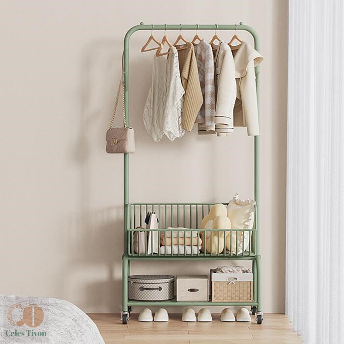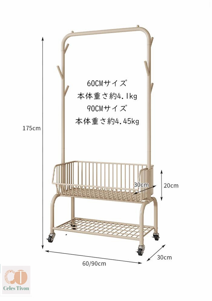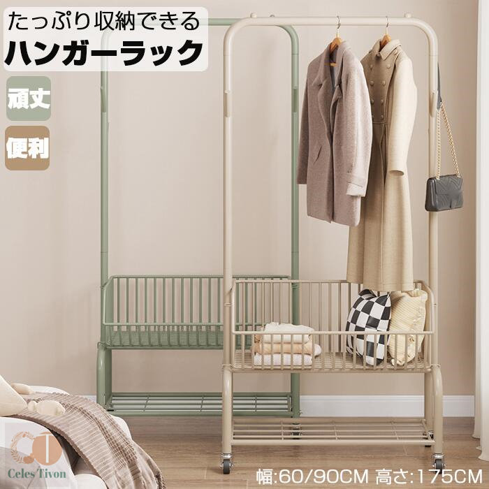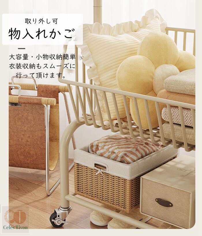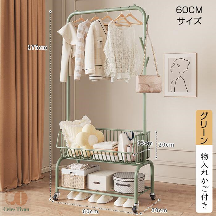 ハンガーフック 物入れかご付き キャス グリーン オフホワイト オフホワイト(かごなし) グリーン(かごなし) M(幅60CM) L(幅90CM)