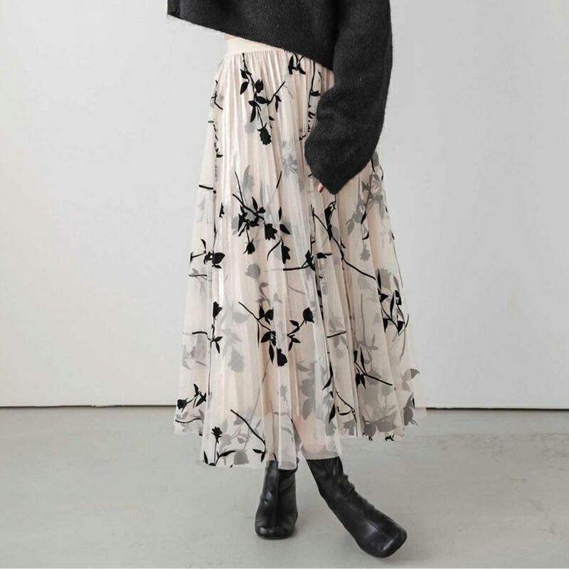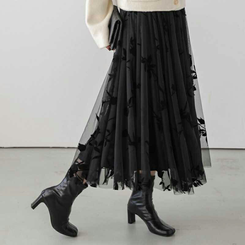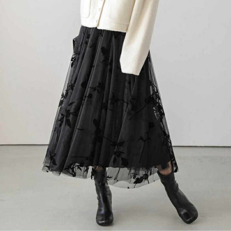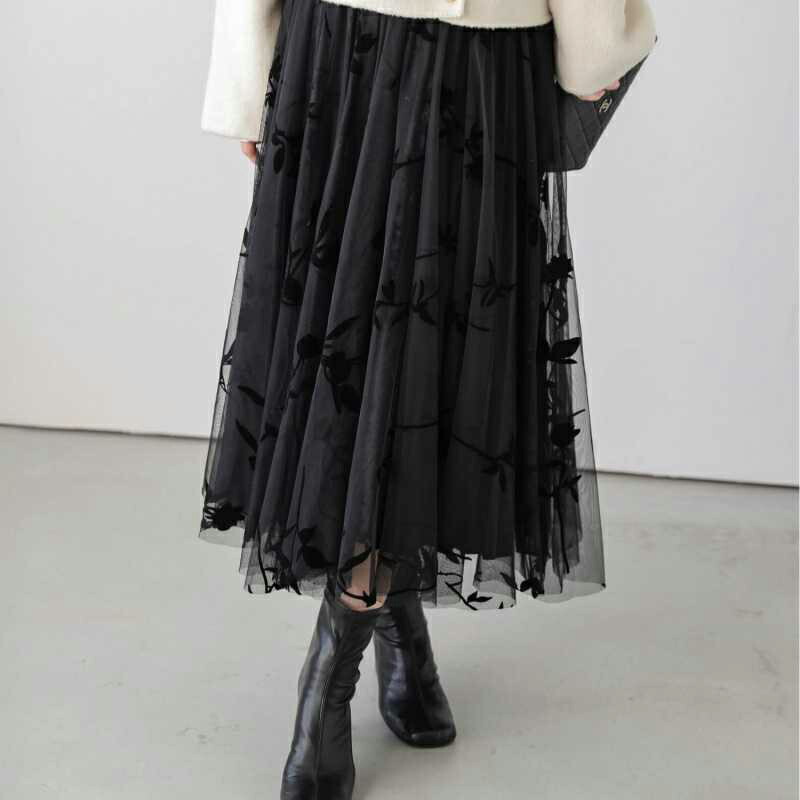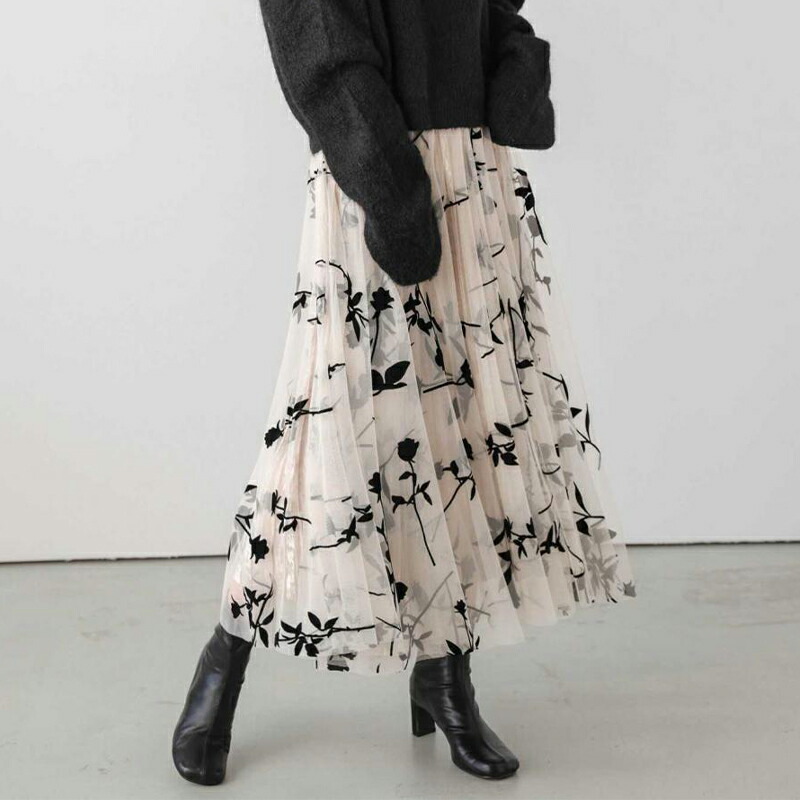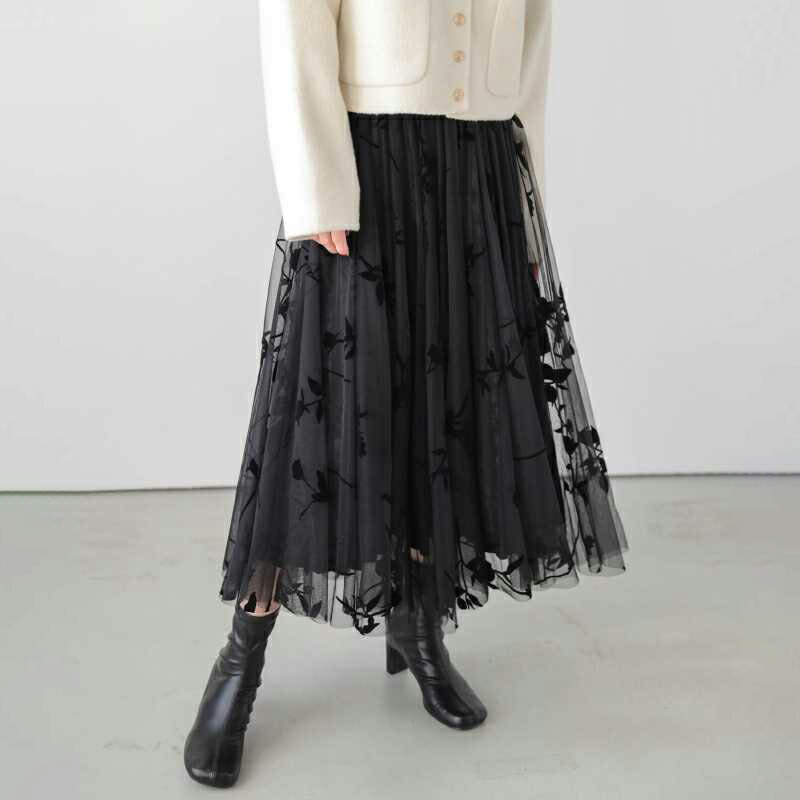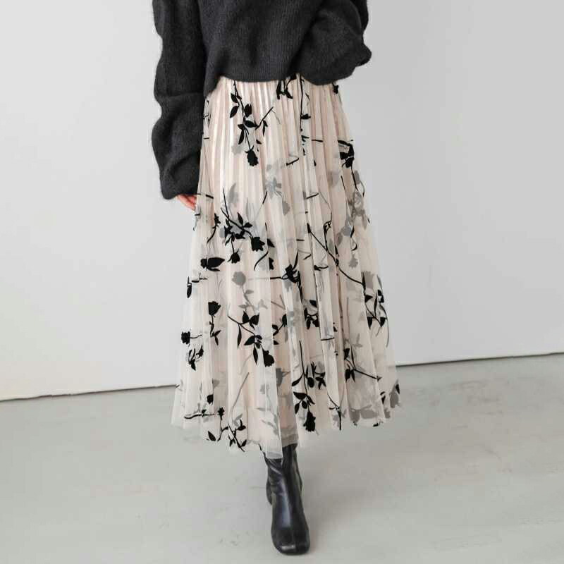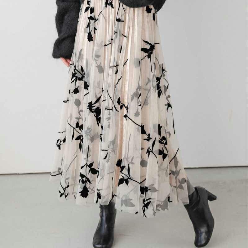 新作 フラワーベロア ロングスカート ボトムス スカート 特集 アプリコット地 フリ ブラック地 フリ