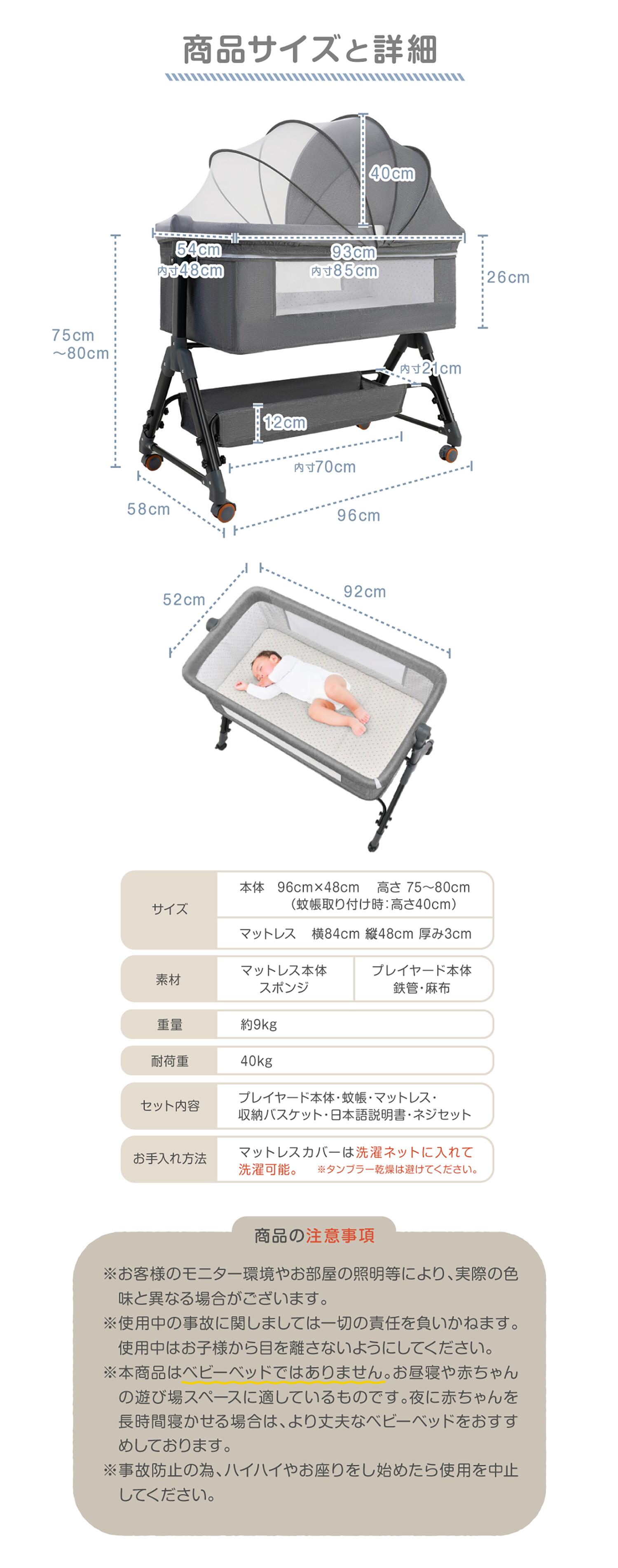 本商品はお昼寝や赤ちゃんの遊び場スペースに適しているものです。夜に赤ちゃんを長時間寝かせる場合は、より丈夫なベビーベッドをおすすめしております。