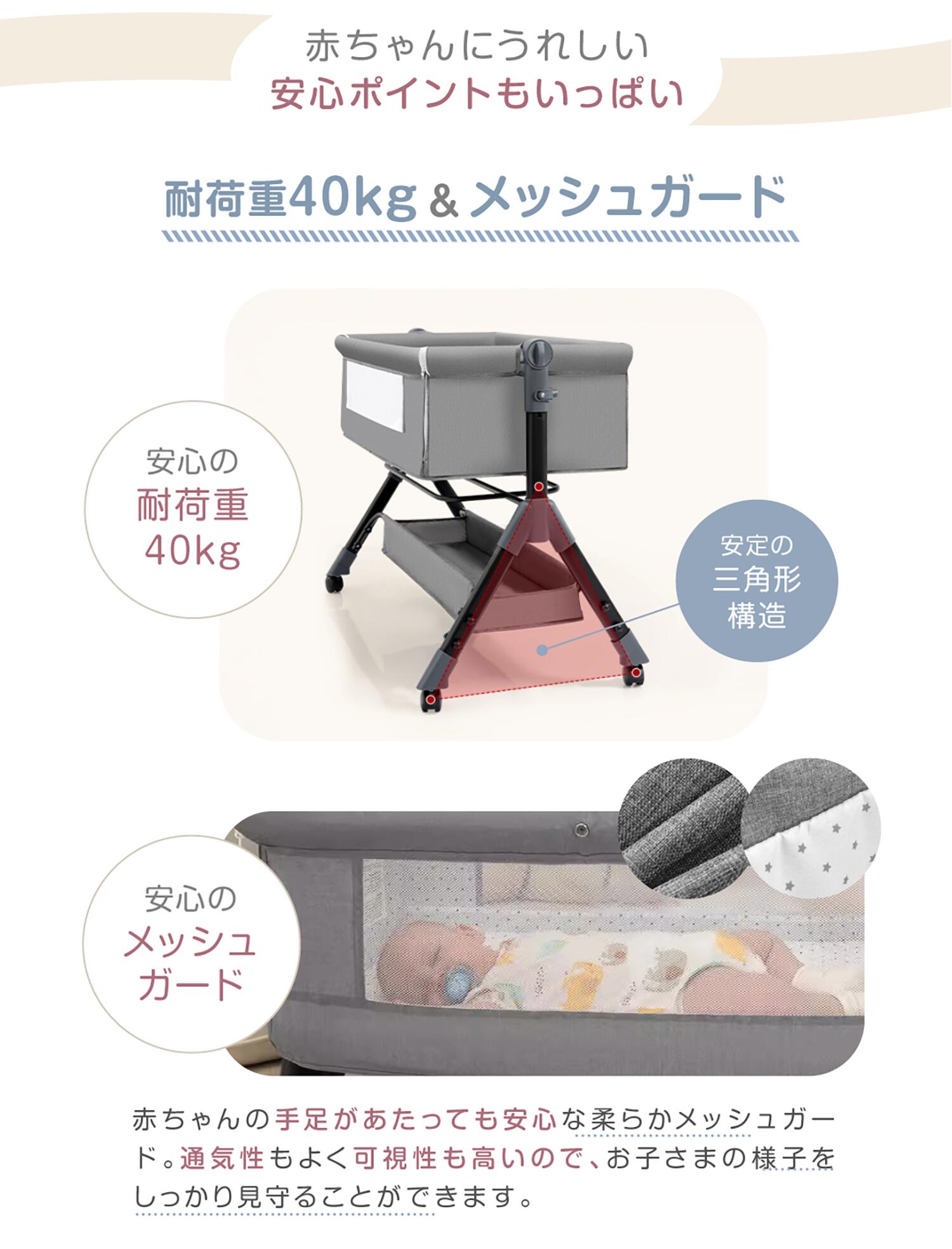 赤ちゃんを蚊や日差しから守る蚊帳付き。ペットのいるご家庭でも心配なく寝かせることができます。