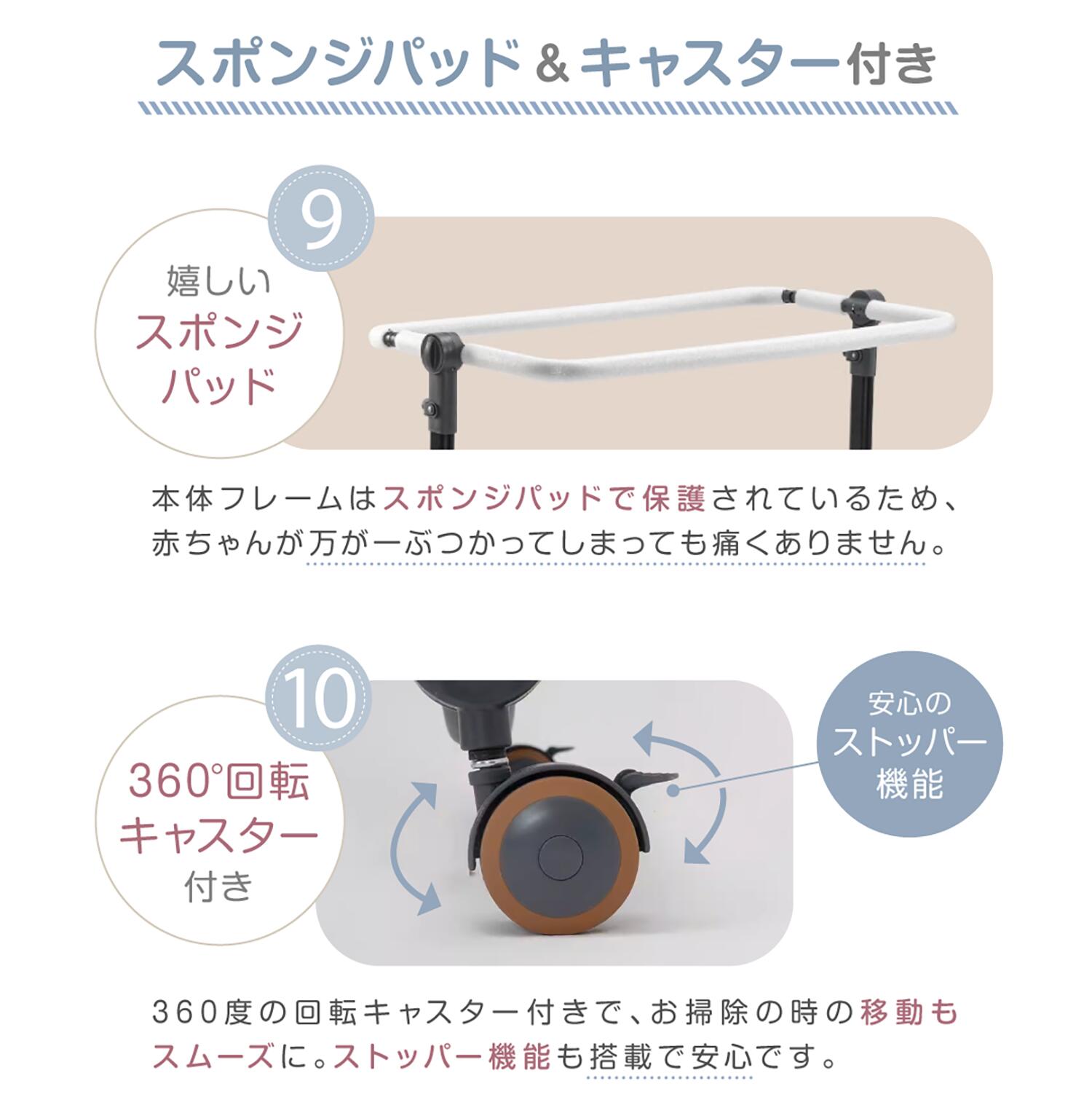 ベッド本体のフレームは、赤ちゃんがぶつかっても痛くないようにスポンジパッドで保護されています。万が一赤ちゃんがぶつかっても痛くありません。