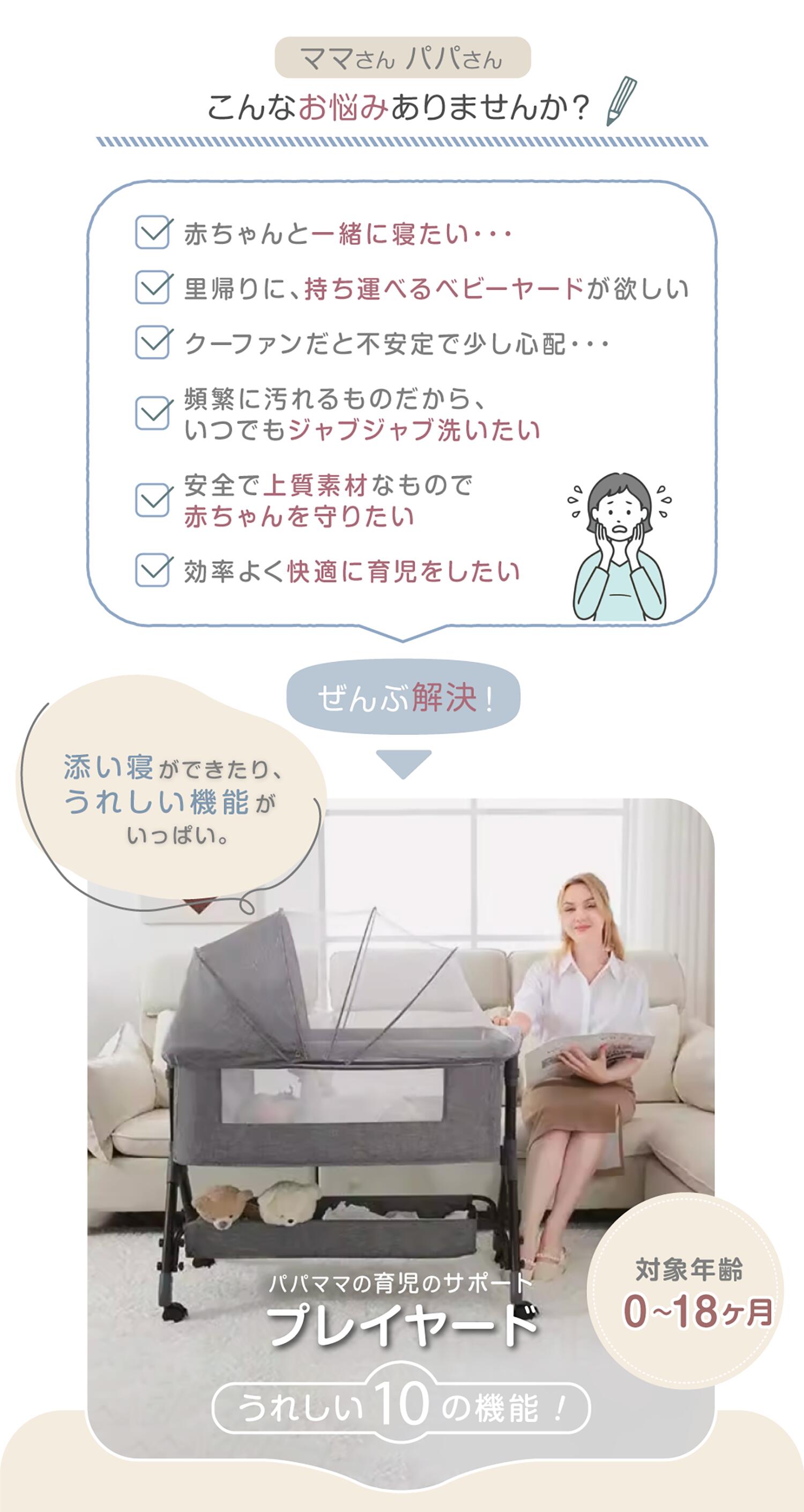 赤ちゃんのお世話をサポートする、様々な機能を持つベビーヤードです。