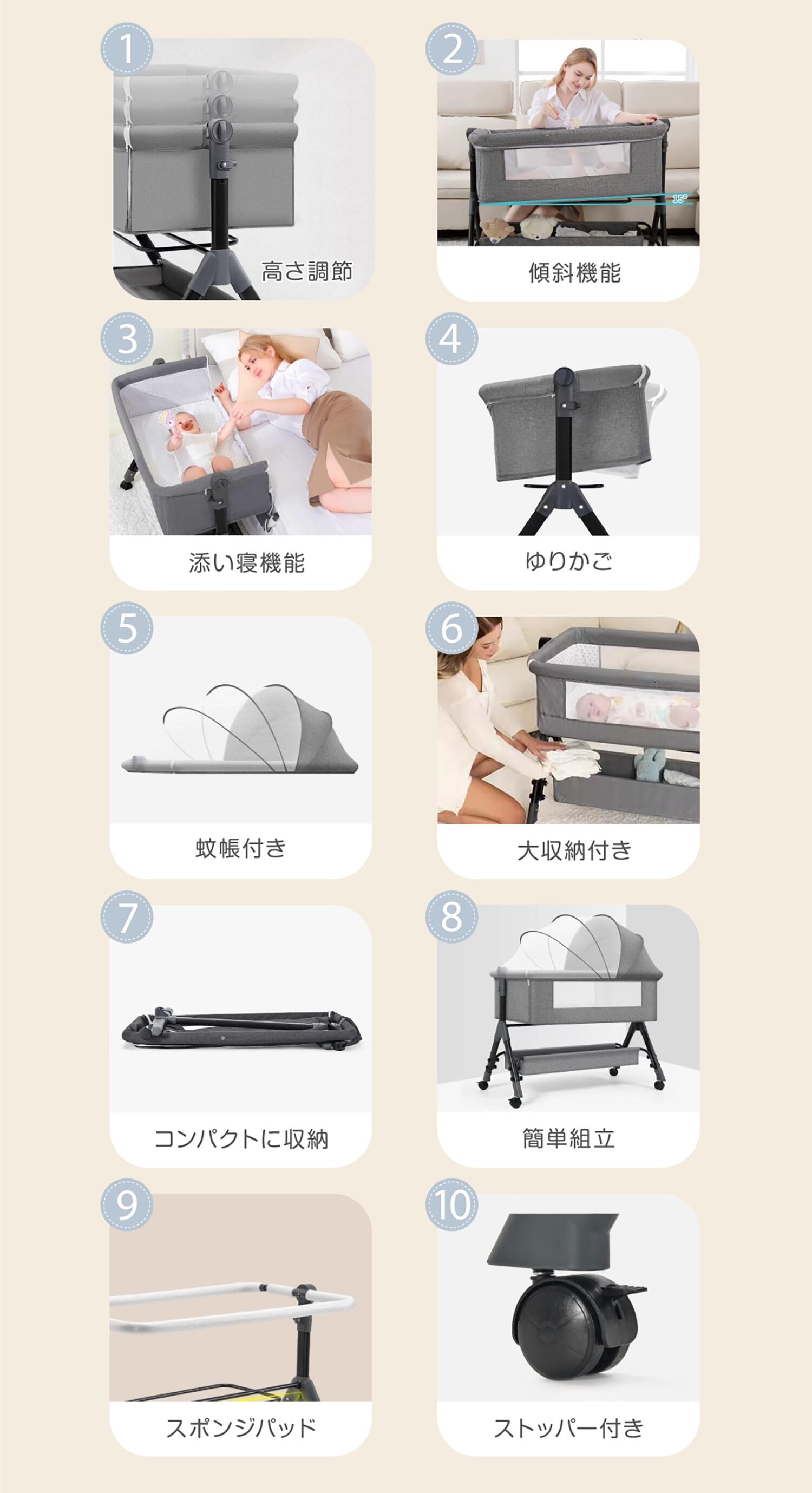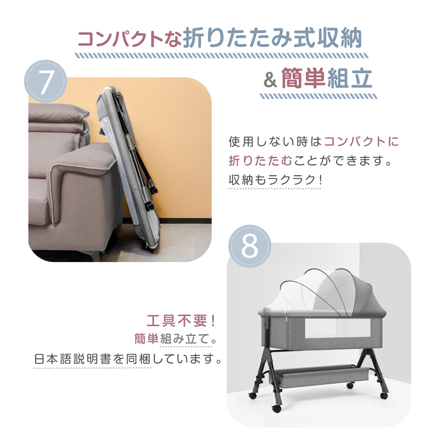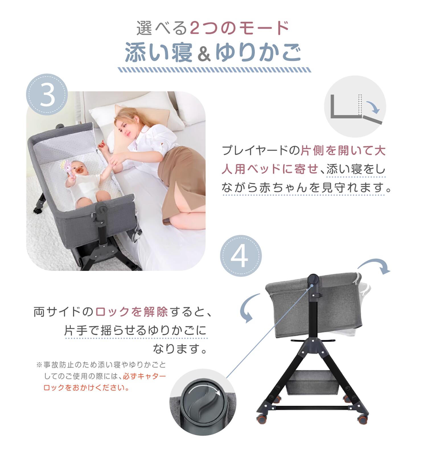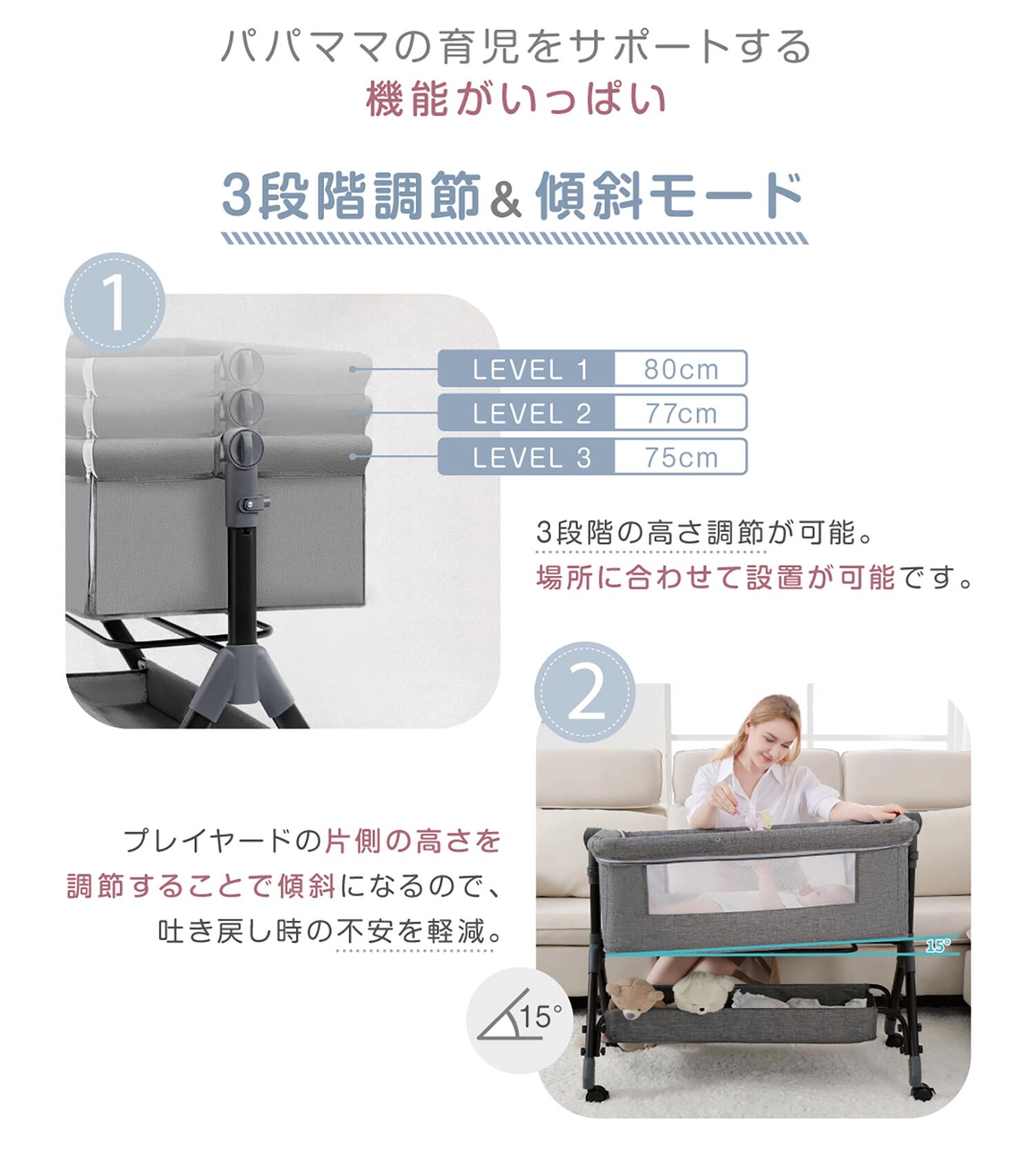 ベッドの片側を開き、大人用ベッドに寄せて添い寝をしながら赤ちゃんを見守れます。