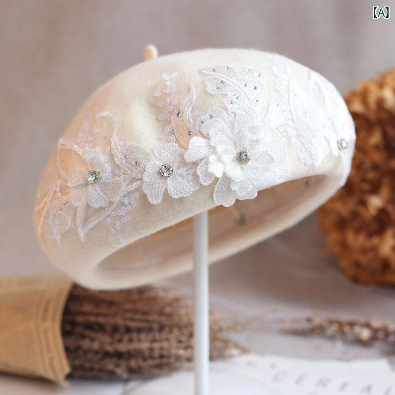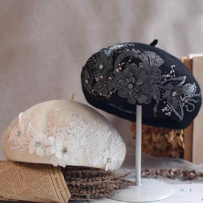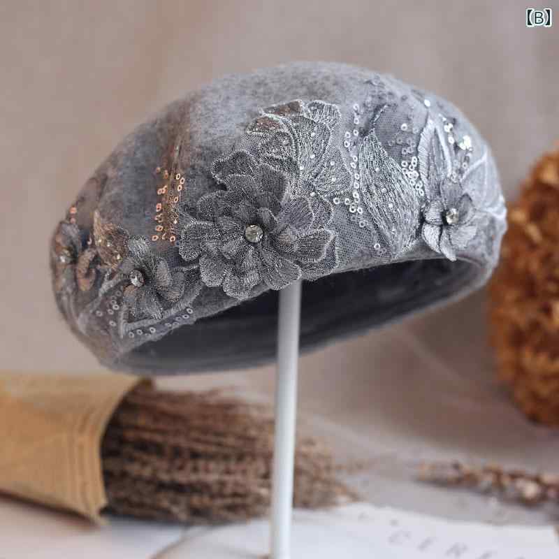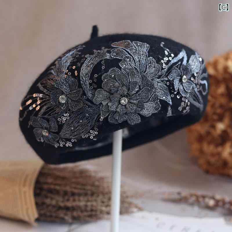 ベレー帽 レディース 帽子 キラキラ エレガント おしゃれ レトロ ウール 秋冬 花 刺繍 ラインストーン スパンコール 白 黒 グレー ハット