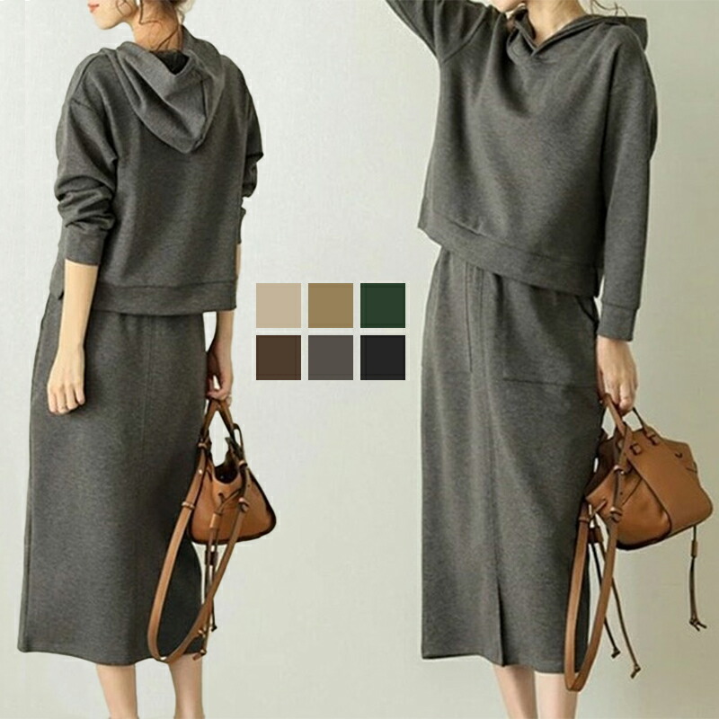 セットアップ レディース 秋冬 スカート パーカー フード付き トップス 上下セット 大人カジュアル ダンボール フード タイトスカート ポケット付き ウエストゴム お出掛け 旅行 無地