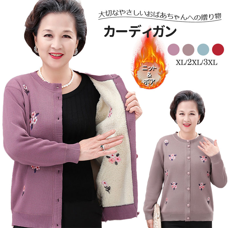 シニアファッション あたたかい ニットカーディガン 裏起毛 軽量 あったか 裏ボア レディース 80代 70代 60代 90代 秋冬 トップス 花模様 おばあちゃん 寒さ対策 プレゼント お誕生 防寒