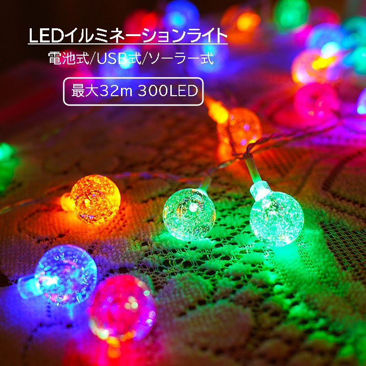 イルミネーションライト バブルライト 20球 40球 100球 電池式 USB式 ソーラーライト 防水 3m 10m 32m 8パターン 点灯 50球 クリスマス ハロウィン 屋内 屋外 電飾 気泡