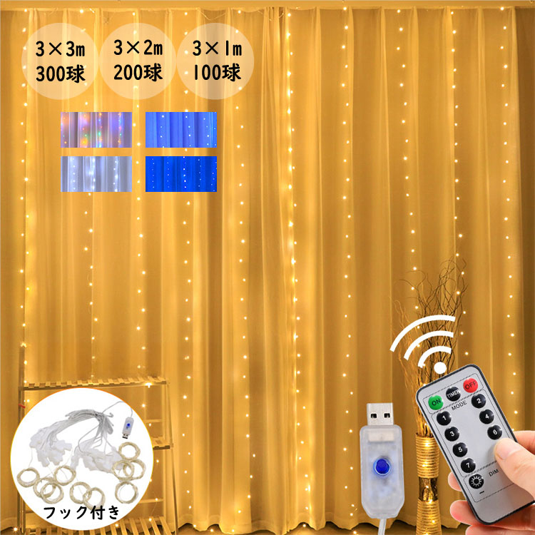 イルミネーションライト ジュエリーライト USB式 300LED電球3M*3M 200球3M*2M 100球3M*1M カーテンライト屋内屋外使用可能 クリスマスライト 8種類の切替モード フック付き