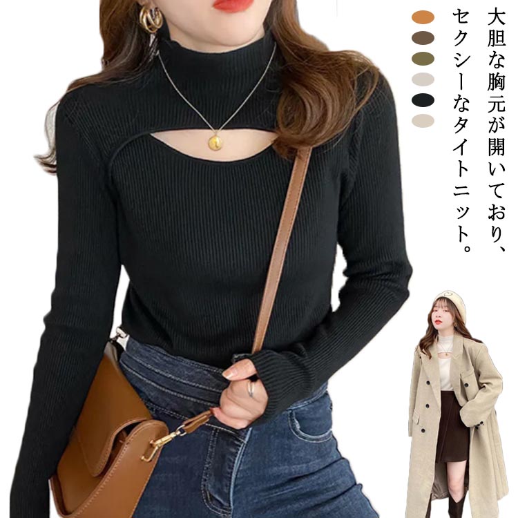 胸元 フロントオープンニットトップス 胸開き 長袖 タートルネック セーター プルオーバー ニットセーター タイト カットアウト オフィス レディース 上品 バスト セクシー リブニット フィット
