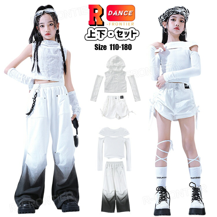 白 k-pop衣装 キッズダンス衣装 セットアップ トップス 女の子 へそ出し スカート 韓国 ダンス ホワイト ヒップホップ ジャズダンス 短パンツ ワイドパンツ アームカバー かっこいい 大 配色