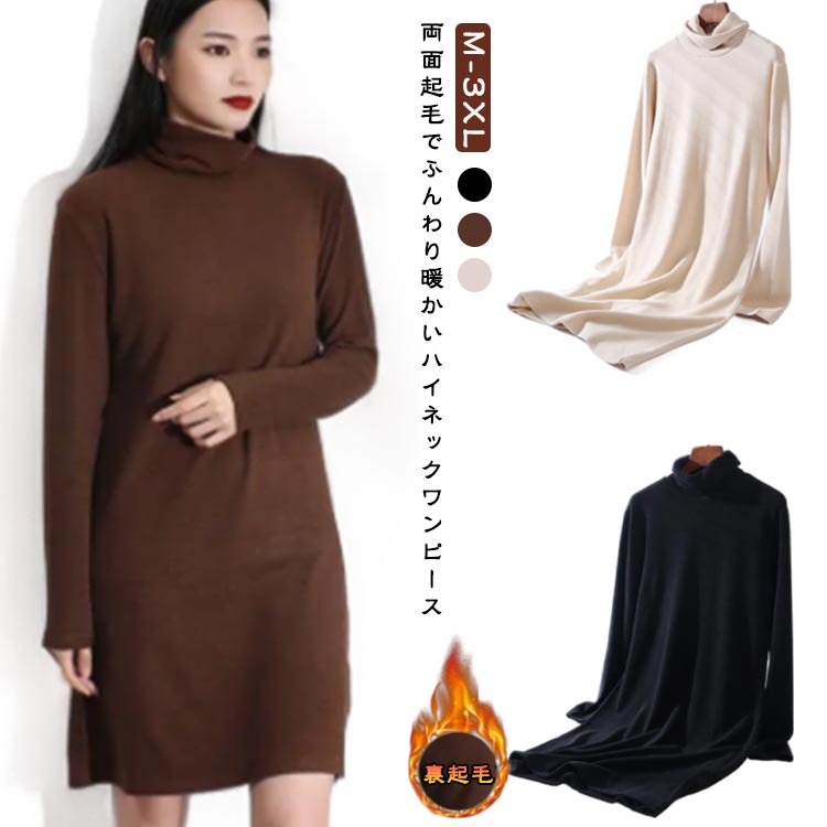 両面起毛 ワンピース 裏起毛 ロングワンピース タートルネック 長袖 レディース 暖かワンピース