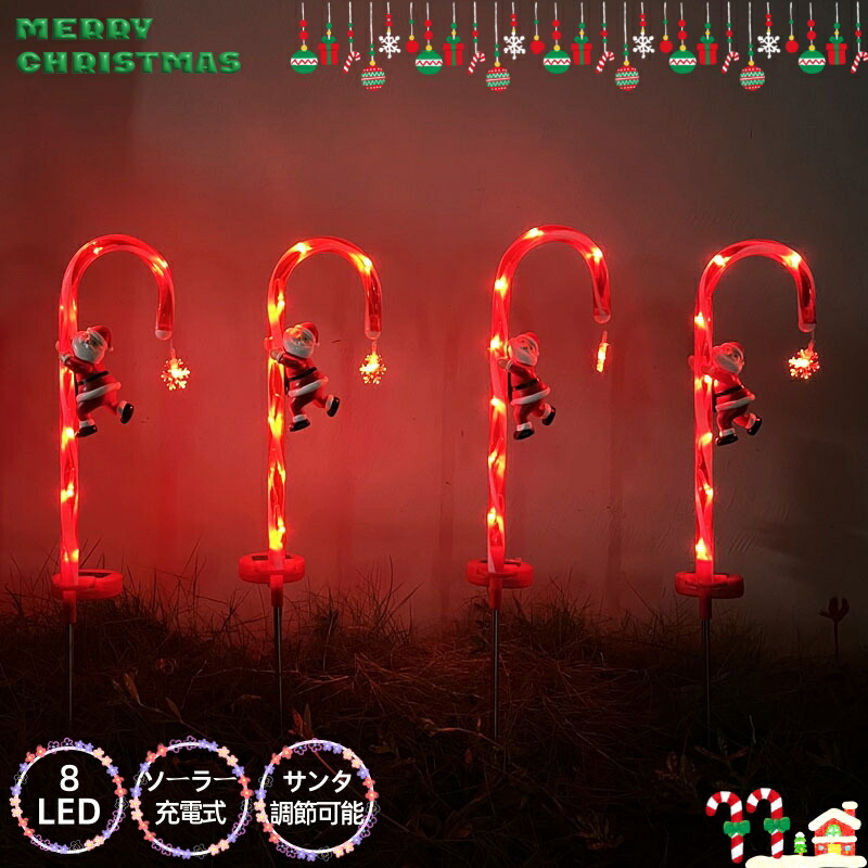 ガーデンライト イルミネーションライト クリスマス キャンディケイン ソーラーライト 屋外 防水 サンタ モチーフ 2本セット