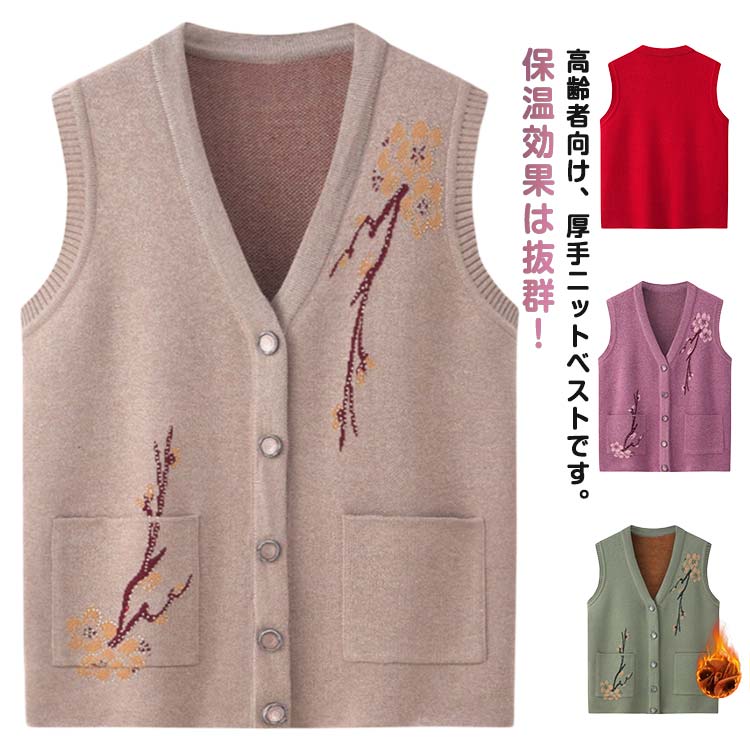 秋冬 おばあちゃん用裏起毛ニットベストです。保温効果は抜群!伸縮性も◎ パープル キャメル色 レッド グリーン
