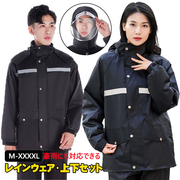 レインコートメンズレディース2点セット上下セットレインウェアレインスーツアウトドア反射テープ付き二重透明バイザー付き裏地付き防災自転車バイク通学通勤豪雨梅雨対策雨具大きいサイズM-4XL