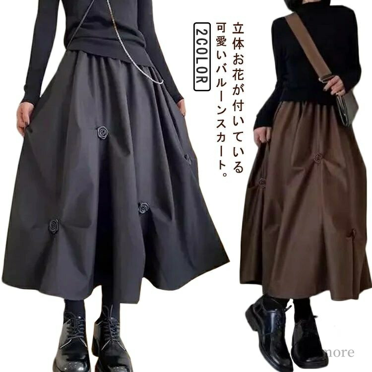 スカート 膝下 立体小花飾り ロングスカート マキシ丈 結婚式 Aラインスカート タック バルーンスカート ウエストゴム