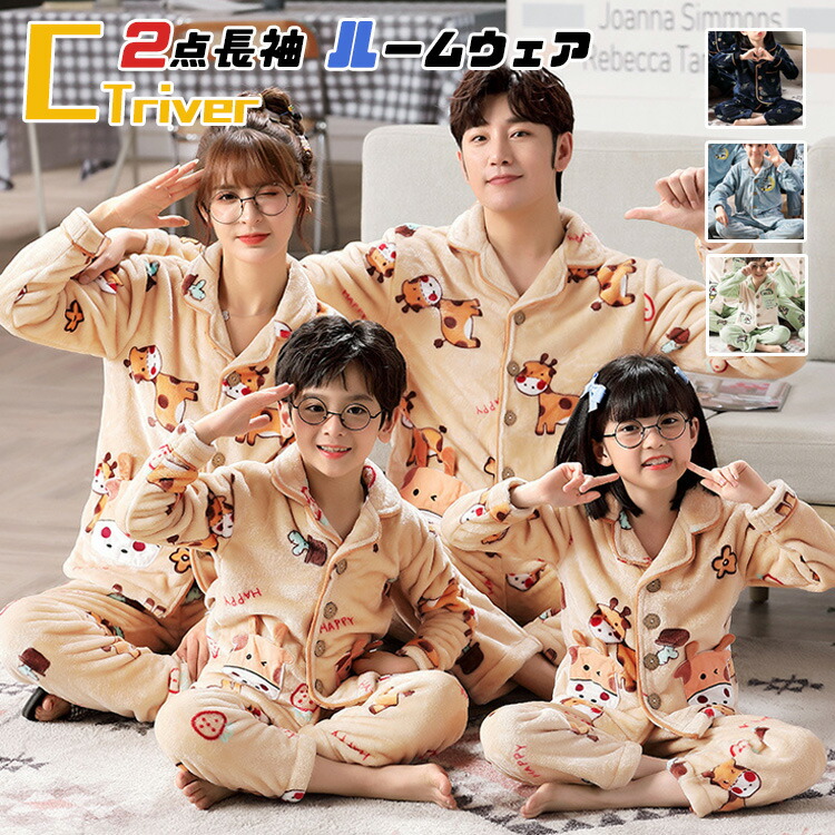 リンクコーデ 親子 セット 冬 フランネルパジャマ 2点セット 親子コーデ モコモコパジャマ 親子ペア ペアルック ルームウェア 着る毛布 動物 裏起毛 恐竜 メンズ トップス ズボン 無 長袖