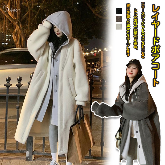 レイヤードボアコート ボアコート 暖かい 防寒 ロング レディース フェイクレイヤード ラムズウール製 長袖 フード付きコート ロング丈 フーディージップアップ ミンクファーコート フ ボアジャケット