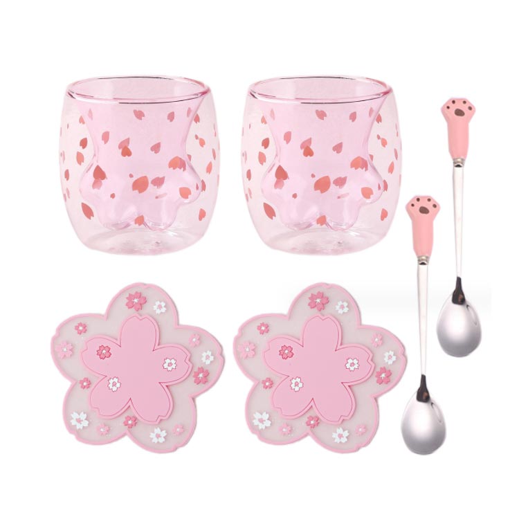 ネコグラス ねこ 6点セット コースタ コーヒー お茶用品 マグカップ ティーカップ コーヒーカップ 豊富な品揃え 透明 ピンク