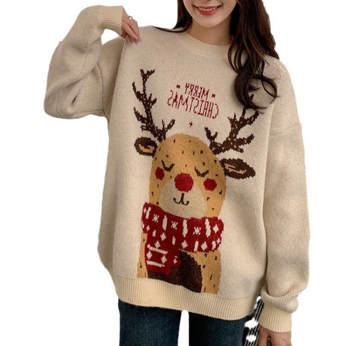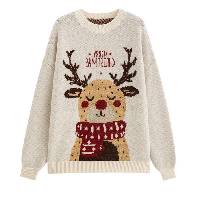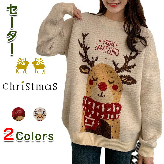 トナカイクルーネックニットセーター ク レディースファッション 豊富 ベージュ レッド