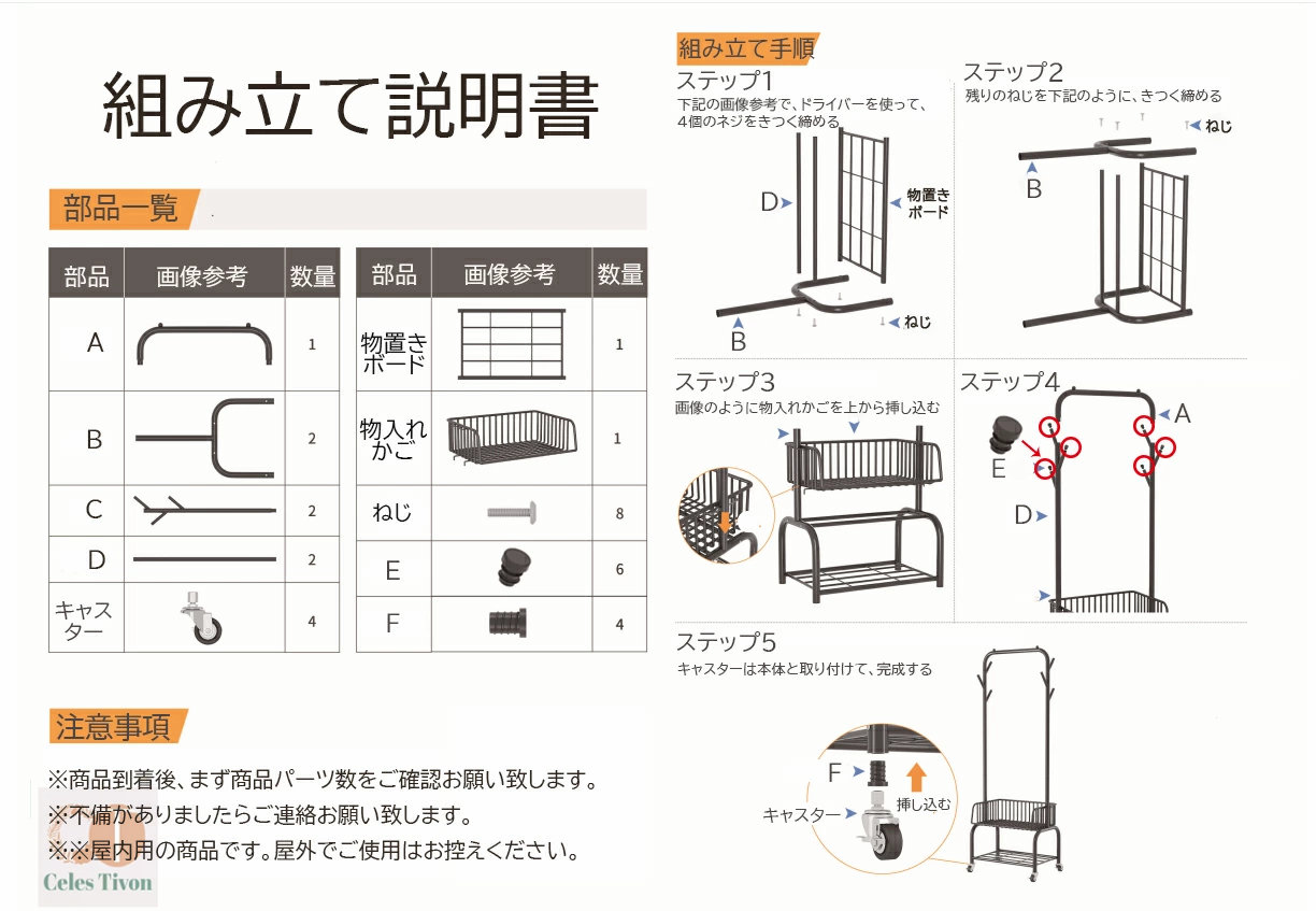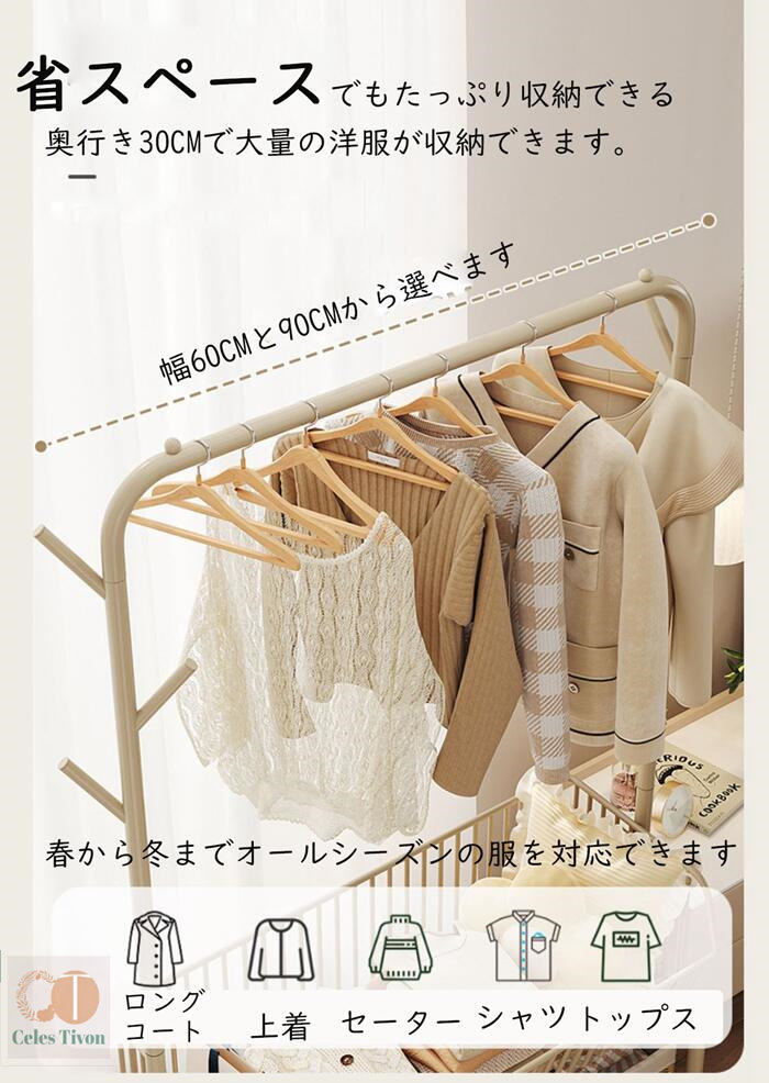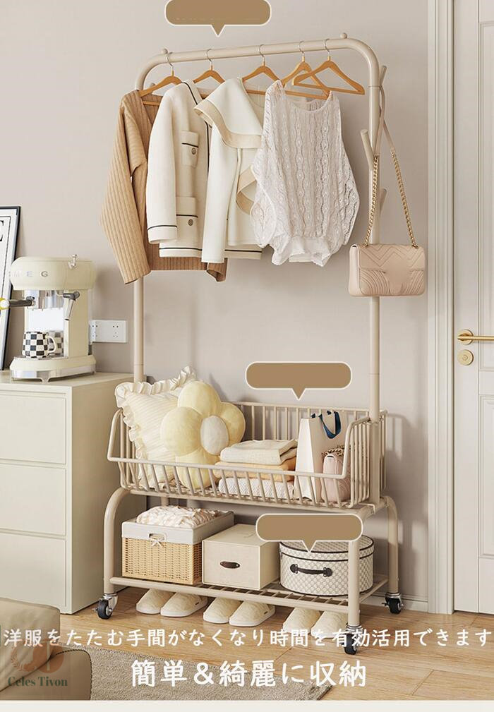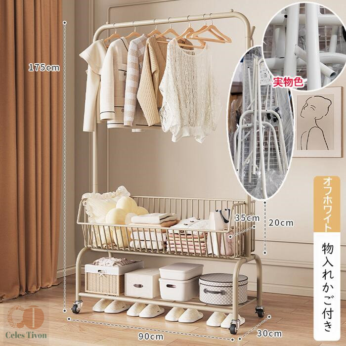 ハンガーフック 物入れかご付き キャス グリーン オフホワイト オフホワイト(かごなし) グリーン(かごなし) M(幅60CM) L(幅90CM)