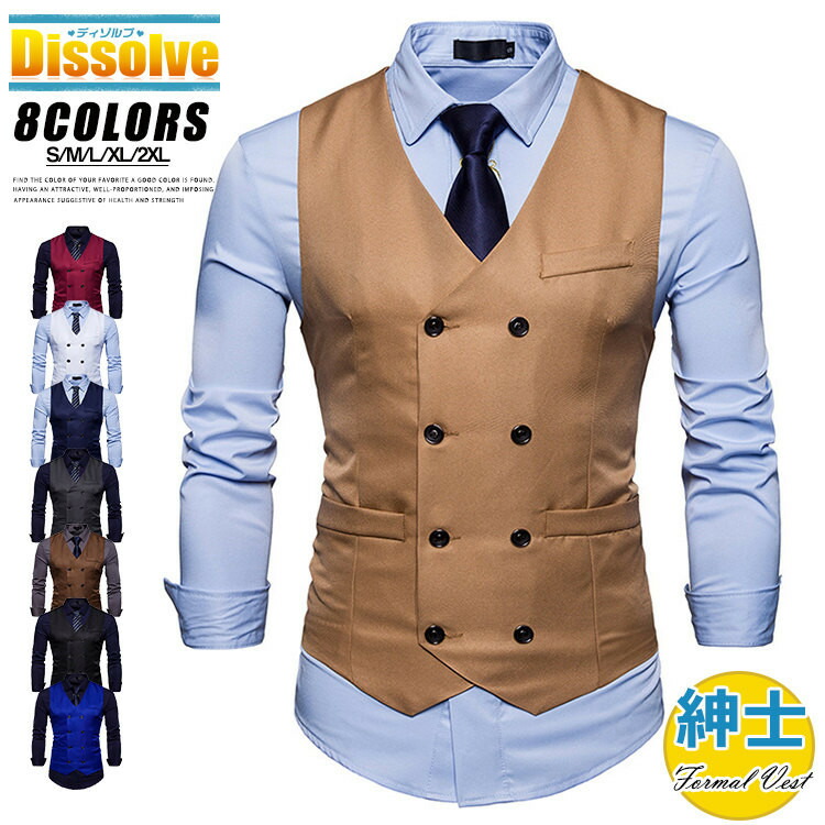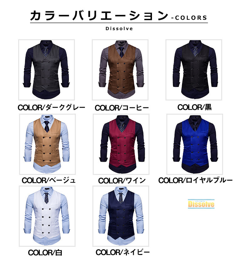 ジレベストメンズベストダブルVネックス トップス ベスト ジレ 豊富 S M L XL 2XL ダークグレー コーヒー 黒 ワイン ロイヤルブルー 白 ネイビー