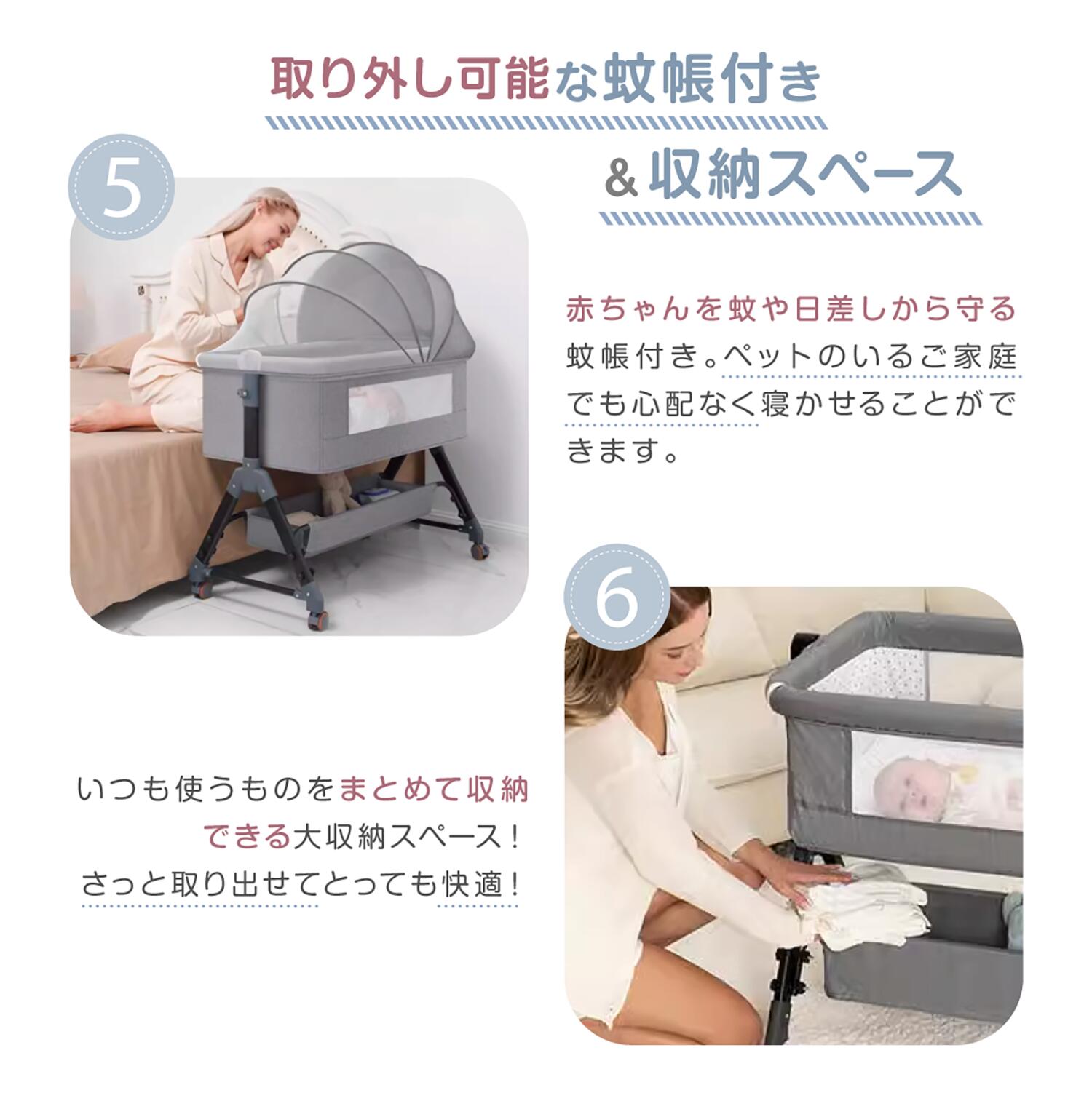 赤ちゃんを蚊や日差しから守る蚊帳付き。ペットのいるご家庭でも心配なく寝かせることができます。