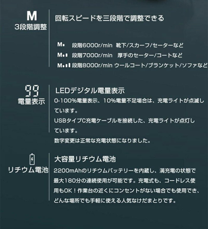 当製品は、2000mAhの大容量バッテリー を使い、充電スピードの加速にも力を入れました。3時間の充電で120分間連続に使用することが可能で、 ソファ・ベッドシーツ・キルトなどのサイズの大きい素材に対応する場合でも、使用中にパワーが落ちるなどの心配はありません。 「充電時間が長く、使っているとすぐパワーが落ちてくる」などの悩みと心配を解決しました。