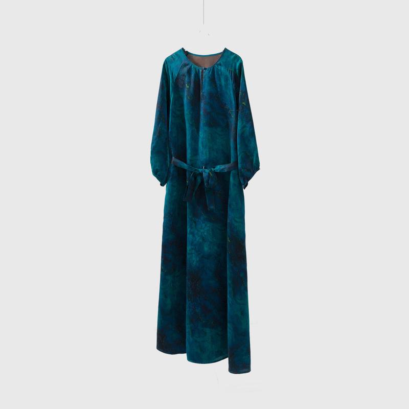 ワンピース レディース 桑蚕糸 シルク A字 ゆったり 花柄 ラウンドネック ロング 深海ブルー 春 長袖
