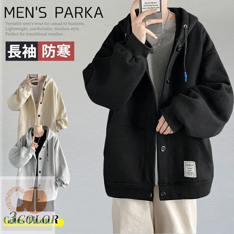 ボタンパーカー メンズ 前開き パーカー 長袖 大きいサイズ ボタン留め 前開きパーカー フード付き 無地 ジャケット アウター トップス フーディー ゆったり 羽織 春物メンズ 春コーデ ブ パーカ