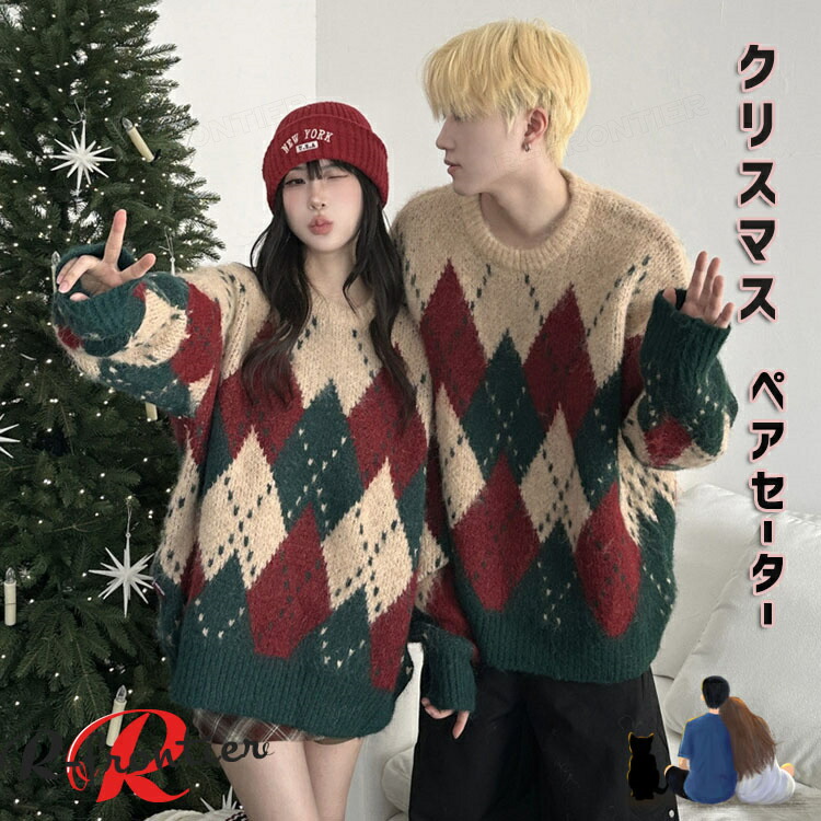 クリスマス カップル ペア ニット セーター 秋冬 ペアルック 菱形 レトロ おしゃれニット メンズ レディース 大きいサイズ ひし形 長袖 丸首 厚 かわいい 可愛い あったか