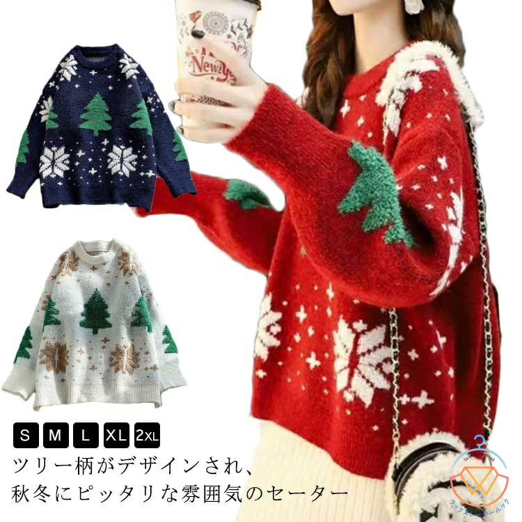 セーター クリスマス ニット 厚手 レディース ペアルック プルオーバー クルーネック サンタ服 男女兼用 春 秋冬 チュニック クリスマスツリー トップス 体型カバー おし 長袖