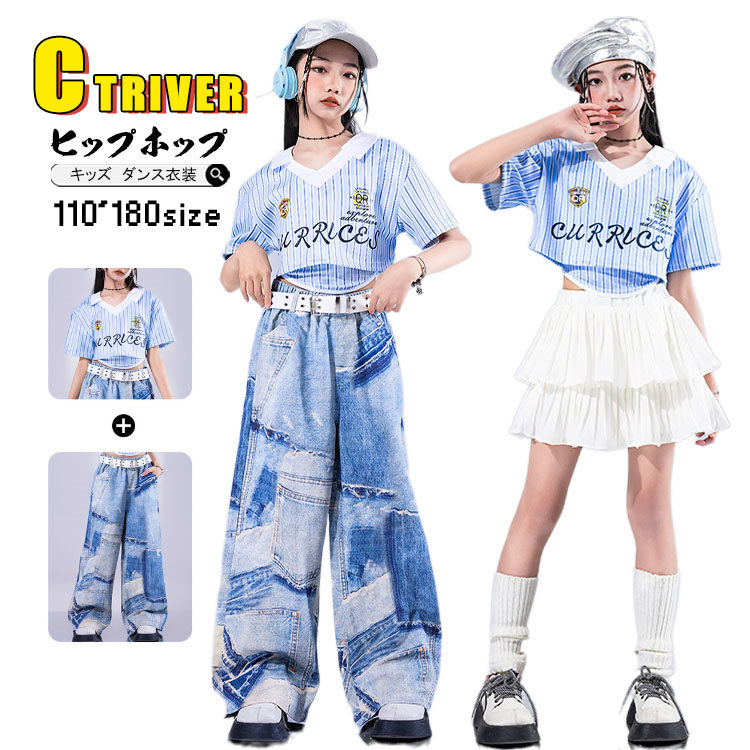 k-pop 衣装 青 キッズダンス衣装 セットアップ ヒップホップ へそ出し トップス 女の子 シャツ 半袖 ストライプ柄 カーゴパンツ ブルー 白スカート 韓国 アイド チアダンス