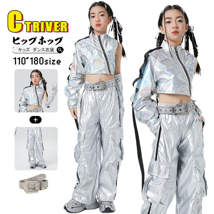 ダンス衣装 キッズ セットアップシルバー メタリック ダンストップス カーゴパンツ スカート ジャズダンス 韓国 ヒップホップ 演出服 110-180