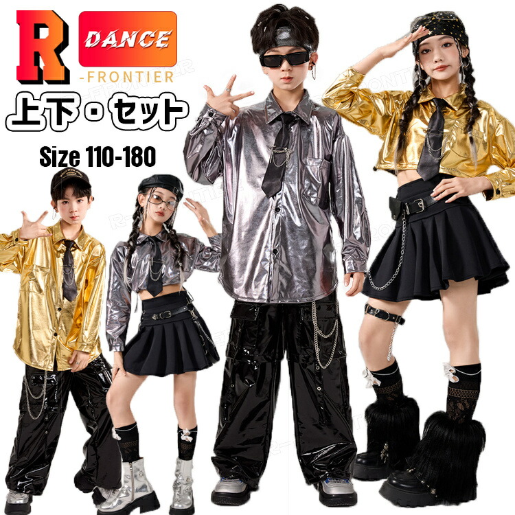 k-pop 衣装 メタリック シルバー ゴールド キッズダンス衣装 セットアップ 長袖 シャツ ダンストップス トップス 黒カーゴパンツ スカート 女の子 男の子 ジャズダンス ヒップホップ j 韓国
