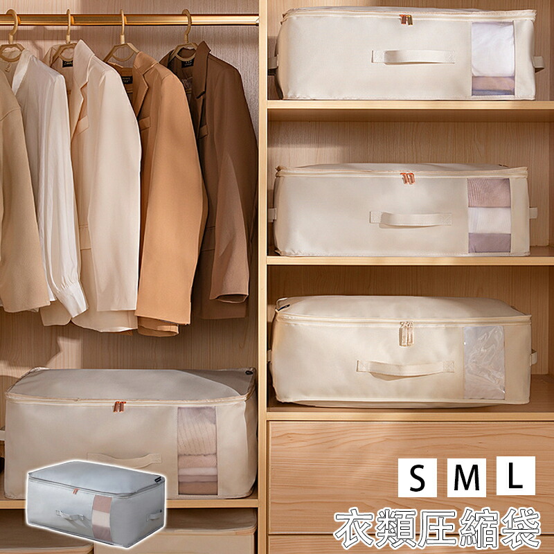 衣類や布団をコンパクトに圧縮できる収納袋。バルブ式で簡単に空気を抜け、押し入れやクローゼットの省スペース化に最適。防塵・防湿効果で衣類を保護