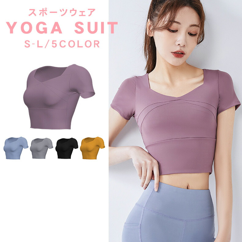 ヨガウェア トップス レディース スポーツウェア シャツ 半袖カップ付き ショート丈 通気 トレーニング 動きやすい 体型カバー 運動 フィットネス ランニング 無地