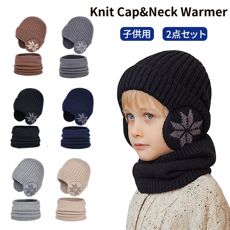 2点セット ニット帽 ネックウォーマー あったか 厚手 4-10歳子供対応
